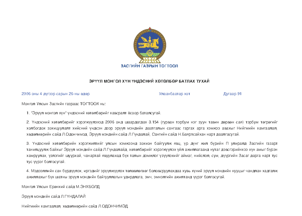 | 2006 оны 4 дүгээр сарын 26-ны өдөр | Улаанбаатар хот | Дугаар 91 |